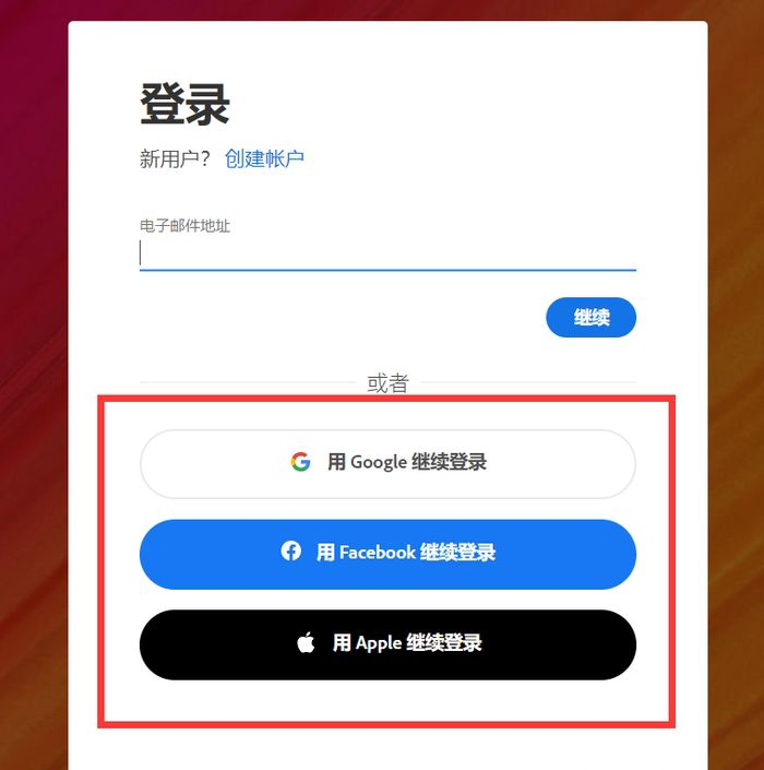 2、进入登陆界面,官方提供给了我们三个可以直接登陆的入口,无需注册。支持谷歌账号、脸书账号、苹果ID直接登陆。