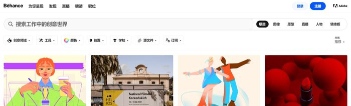 打开之后,我们就可以看到behance的主界面了,映入眼帘的都是大量的创意作品。