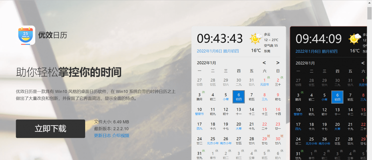 优效日历是一款三无(无广告、无弹窗、无推送)桌面日历软件,还有两无,一是无需联网就能使用其核心功能,二是无需安装,最新版的可执行文件大小也只有 6.49MB。用户交互界面与 Windows10 自带日历相似,界面简洁,显示全面丰富,有很多种实用小功能,例如整点报时、节日管理、屏幕截图和钉图、云复制、定时任务、排班等。