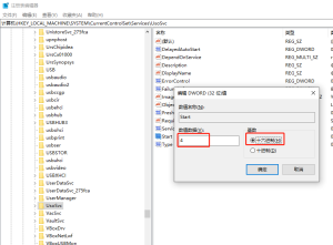 2、在注册表设置中,找到并定位到 [HKEY_LOCAL_MACHINESYSTEMCurrentControlSetServicesUsoSvc]。然后在右侧找到“Start”键。