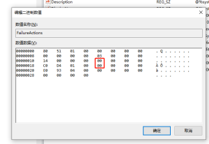 4、继续在右侧找到“FailureActions”键,右键点击修改该键的二进制数据,将“0010”、“0018”行的左起第5个数值由原来的“01”改为“00”,完成后,点击下方的“确定”即可。
