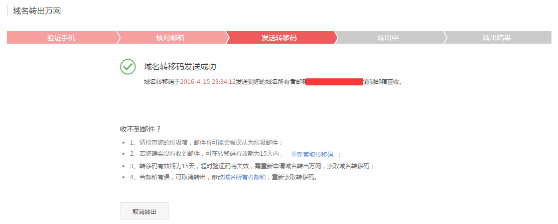 接着会出现一个验证的流程,先是输入手机验证码进行验证,再输入你的邮箱进行验证,这两项通过以后,万网会把域名转出码发送到你的域名注册邮箱