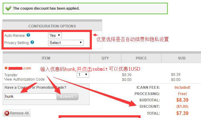 接着跳转到结算的页面,因为你转入的域名必须要在namesilo续费一年,在CONFIGURATION OPTIONS那里设置是否自动续费和是否使用隐私保护,并在promotion code那里输入hunk,并点击submit, 可以优惠1USD,最后点击CONTINUE进行付款