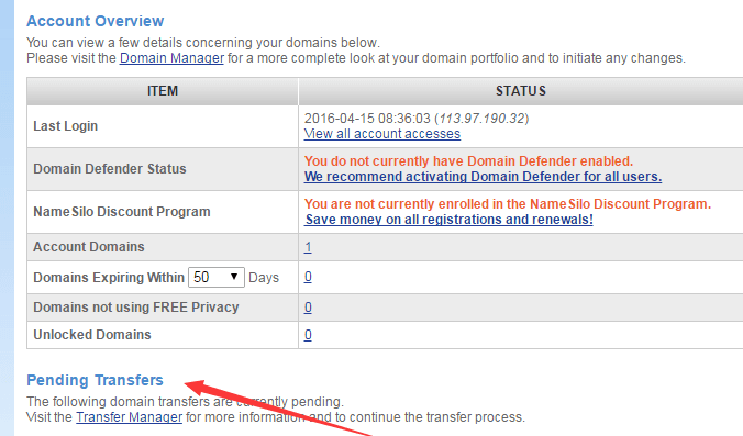 付款完成后,在pending transfers这里会显示域名转出正在进行中