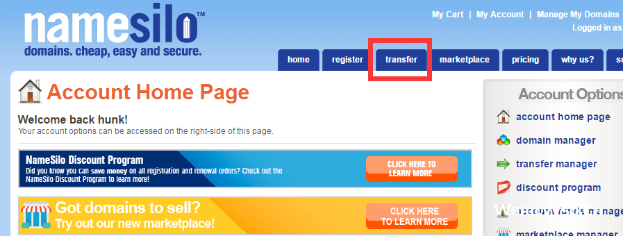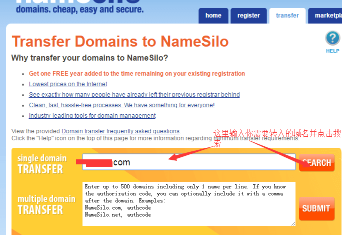 接着到namesilo.com 注册并Login,点击顶部菜单上的transfer,会跳转到转入域名的页面,然后在搜索框里面输入你要万网域名,并点击SEARCH
