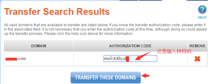 接着会出来域名转入的页面,这个时候你需要进到你的邮箱复制万网的转出码,并粘贴到AUTHORIZATION CODE这个框里面,并点击TRANSFER THIS DOMAIN