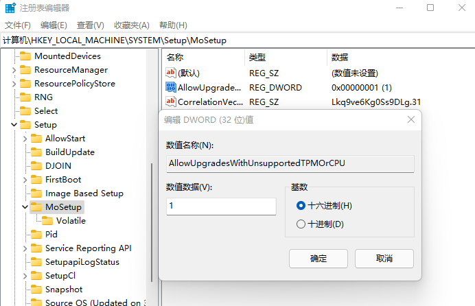 - 名称设为 AllowUpgradesWithUnsupportedTPMOrCPU,值为 1