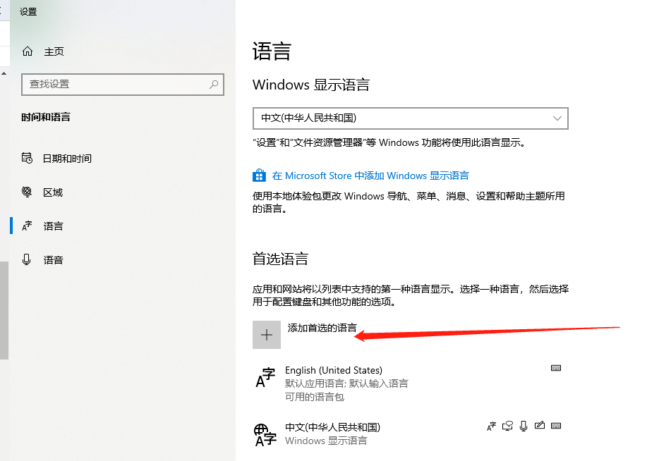 点击添加首选的语言,搜索US找到英语(美国)并添加,这里我们注意只需要添加最基础的即可,语音什么的不需要,添加完毕后,拖动我们刚刚添加的语言到第一个,这样他就成为默认语言了