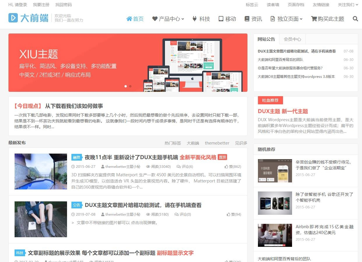 DUX主题支持专题功能、百度收录推送、人机验证、多级分类筛选器,适用于垂直站点、科技博客、个人站,扁平化设计、简洁白色、超多功能配置、会员中心、直达链接、自动缩略图等等。7.0版本支持PHP8,新增文章专题。