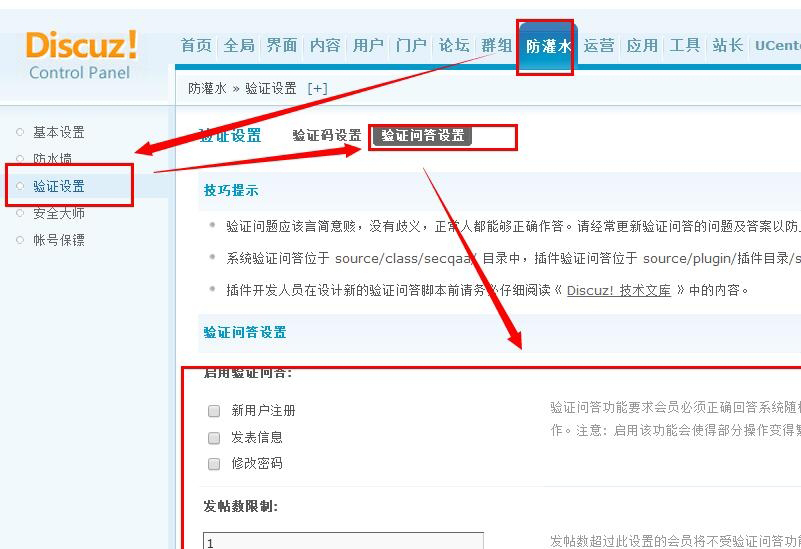 登陆网站后台>>防灌水>>验证设置>>验证问答设置