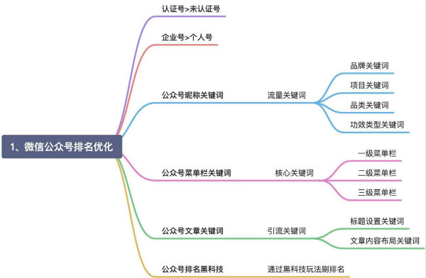 通过以上思维导图我们可以看出微信公众号排名引流的一些细节操作,在排名中认证的账号排名优于个人号。