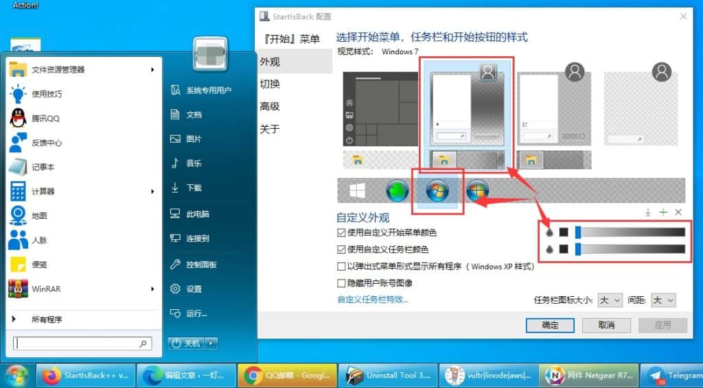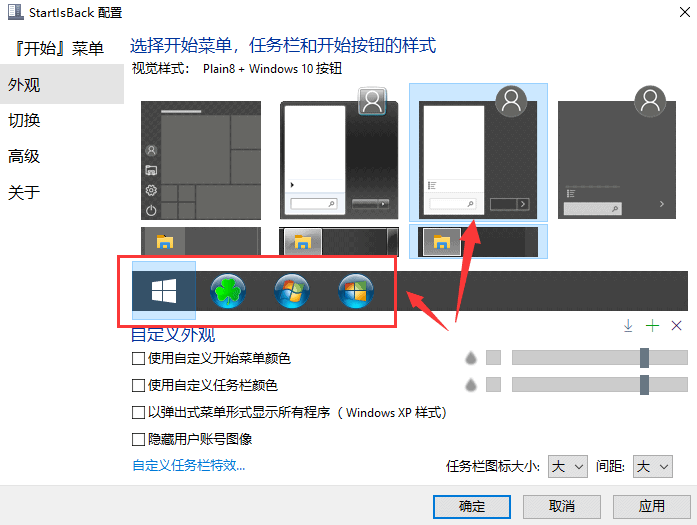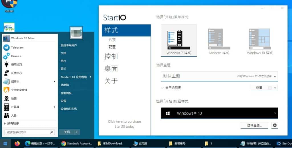 我们用Start10这类软件就是奔着“Windows7样式”开始菜单去的,所以都选择带“Windows7”字眼的准没错,但是开始菜单按钮没有Windows7样式的,但这里可以自定义图标,找到Win7开始按钮图标自定义就OK了。我这里使用Windows10的开始菜单按钮,效果如下图所示: