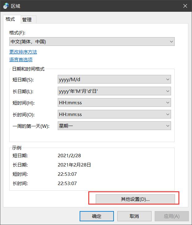 5. 此时弹出“区域”设置对话框,点击最底下的“其他设置(D)...”,并点击进入