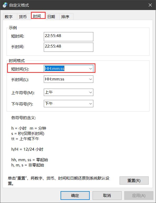 6. 在打开的“自定义格式”对话框中,定位到“时间”选项卡,在展开的“时间”选项卡中,找到“时间格式”-“短时间”,并将短时间内容输入为 HH:mm:ss 注意符号要在英文状态下输入(下拉菜单中没有该选项,只能手动输入),最后点击应用-确定,退出所有对话框。