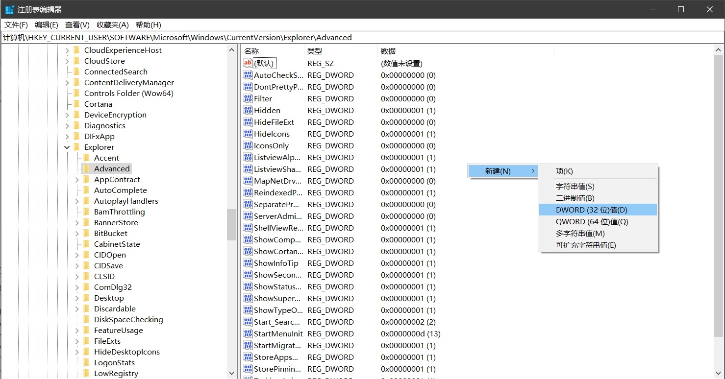 8. 在注册表编辑器中,定位到:HKEY_CURRENT_USERSOFTWAREMicrosoftWindowsCurrentVersionExplorerAdvanced 在右侧空白处点击右键,选择 新建-DWORD(32位)值,
