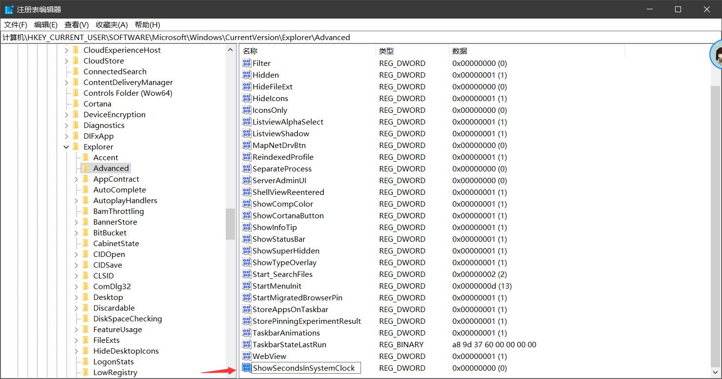 9. 将新建的DWORD值名称修改为 ShowSecondsInSystemClock