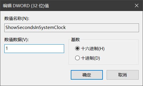 10. 双击刚刚建立的ShowSecondsInSystemClock值,在弹出的窗口中把其中的数值修改为 1 最后重启电脑就可以在任务栏右下角时间区域显示秒钟了。