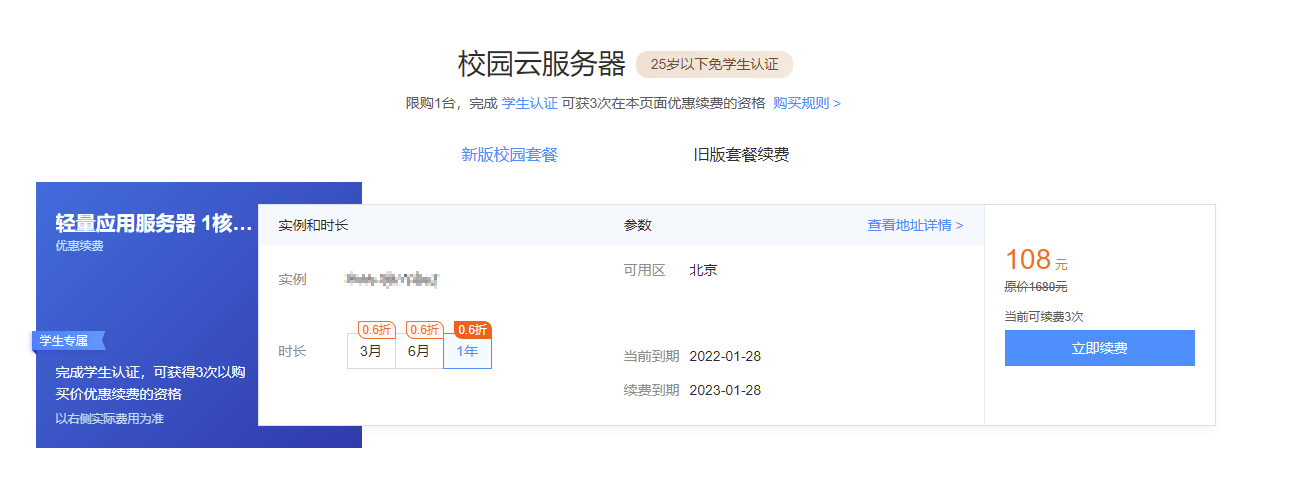 二、再次打开:https://curl.qcloud.com/DNpk1mGq 把续费次数用完。 以108元的优惠价续费一年,总共可以3次。记得续费完再进行第三步升级,否则升级后无法续费!