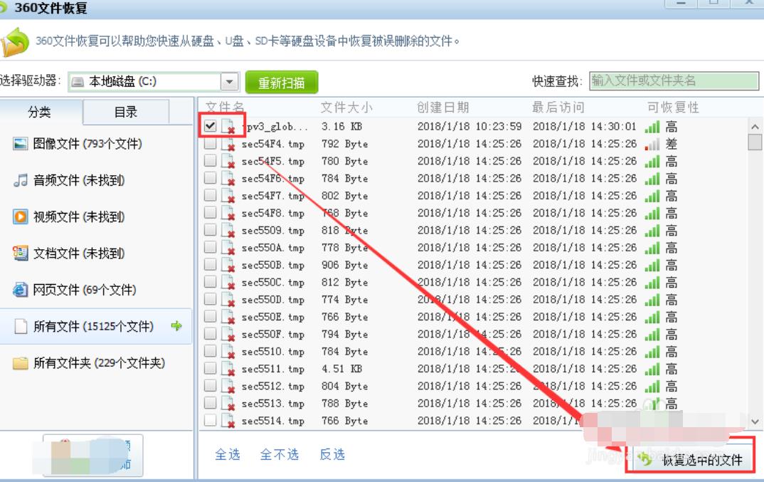 3,扫描出C盘被删除的文件,然后选择并勾选需要恢复的文件,点击下边的恢复选中文件即可进行恢复