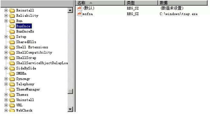HKEY_LOCAL_MACHINESOFTWAREMicrosoftWindowsCurrentVersionRunOncemsfsa值: C:windowstsay.ex