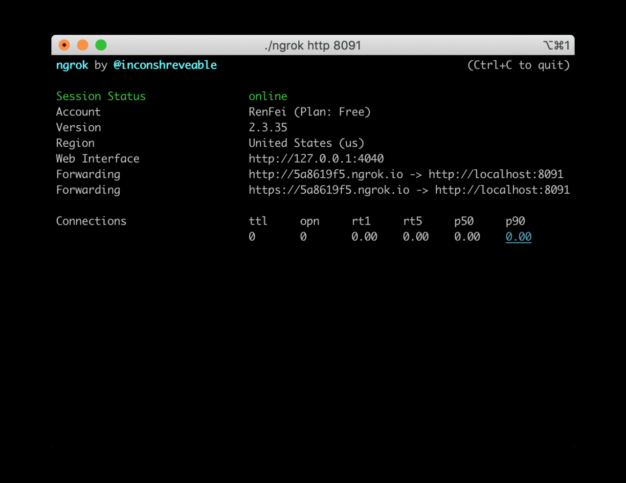 Forwarding:提供的地址就是互联网地址,通过这个地址就可以访问到你设置的本地端口,这里演示的是:http://5a8619f5.ngrok.io,需要注意的是,免费套餐的这个地址是随机的,每次启动都会变化,如果希望要一个固定不变的网络地址,就需要付费套餐了。当然你也可以增加一个subdomain参数尝试申请本次指定的域名,但不会一直保留给你,你需要每次都申请,例如我希望域名是renfei: