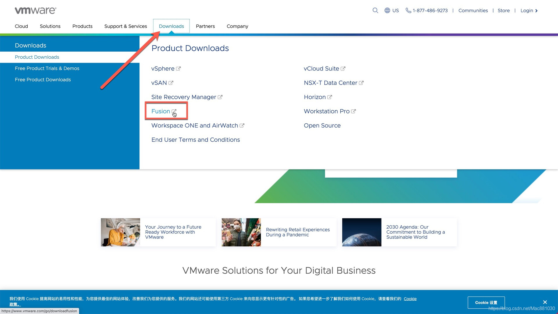 先用谷歌浏览器打开 https://www.vmware.com/ 进入VMware虚拟机的官网,点击Downloads—Fusion