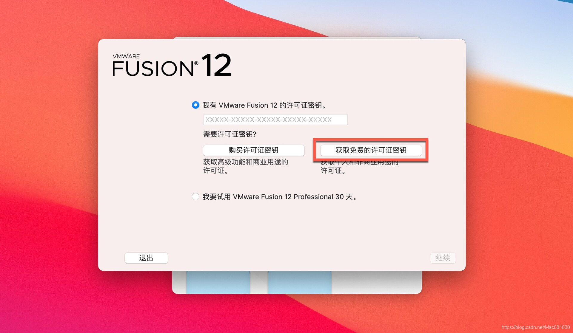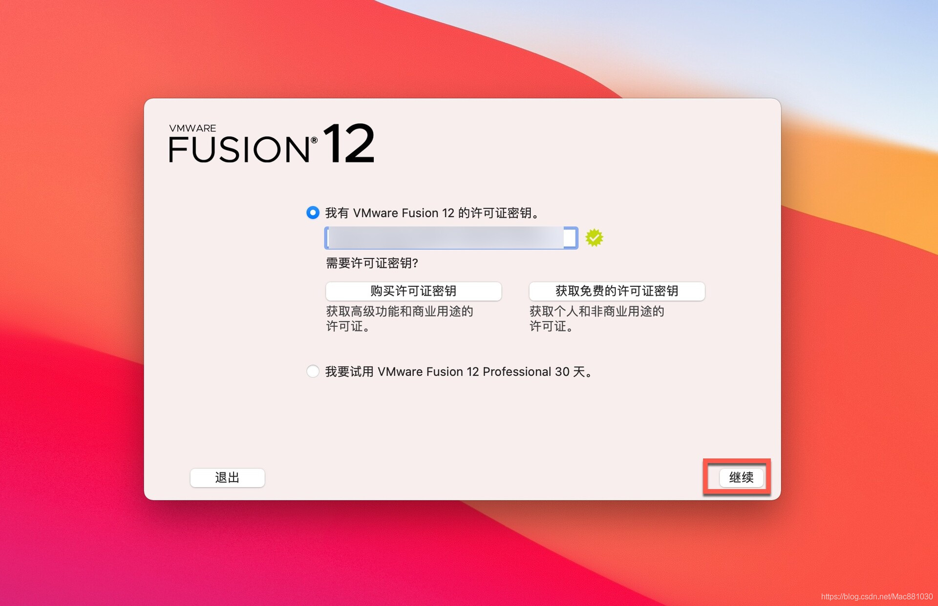 将获取的注册密钥复制到指定位置点击继续,VM虚拟机就可以免费使用了!