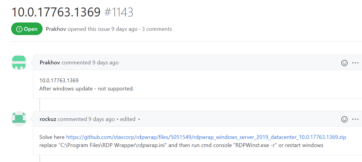需要到这个代码仓库的issues里面搜索你的系统版本(也就是上面的10.0.17763.1369字眼),一般来说都会有人贴出新系统的配置信息,你只要把这个配置信息粘贴到刚刚那个rdpurap.ini文件的末尾就行了.例如下图: