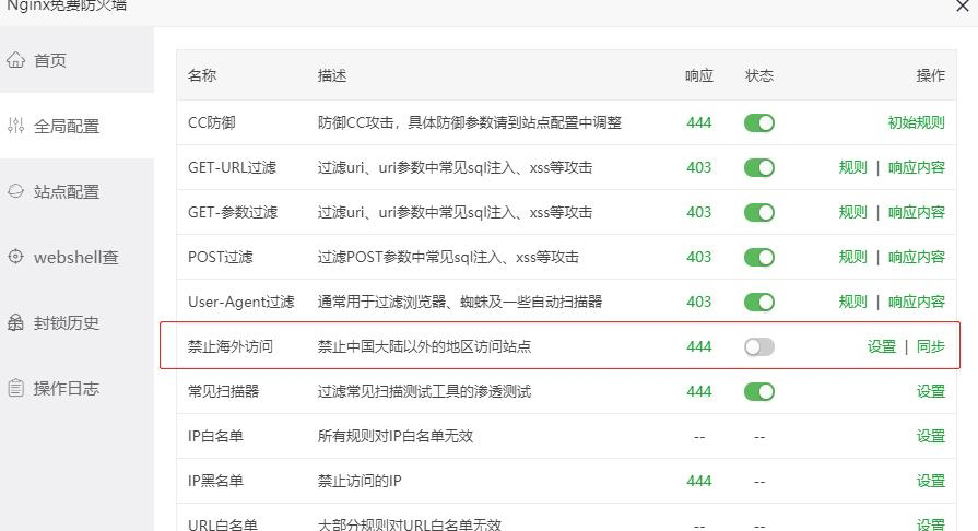 这个防火墙免费且功能强大几乎和付费版的差不多了,而且比较确定很可能是出自官方的作品。你需要注册宝塔账号然后登陆才可以安装这个免费的防火墙,安装好之后默认会开启 禁止中国大陆以外的地区访问站点的选项。