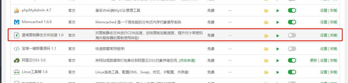 1、宝塔静态文件加速,对面板静态文件进行CDN加速,加快面板加载速度,提升对小带宽和海外服务器的面板使用体验!我们很多人买的服务器都是默认1Mbps的带宽,但是我们知道增加带宽的费用又很贵的,所以建议开启 堡塔面板静态文件加速 1.0这个软件,感觉速度提升还是比较明显的,宝塔面板首页打开比较慢大概有2.3M大小的网页,所以1Mbps的带宽大概需要最快的理论速度为18s。但是使用了这个加速之后只需要2-3s左右就可以完成加载了。