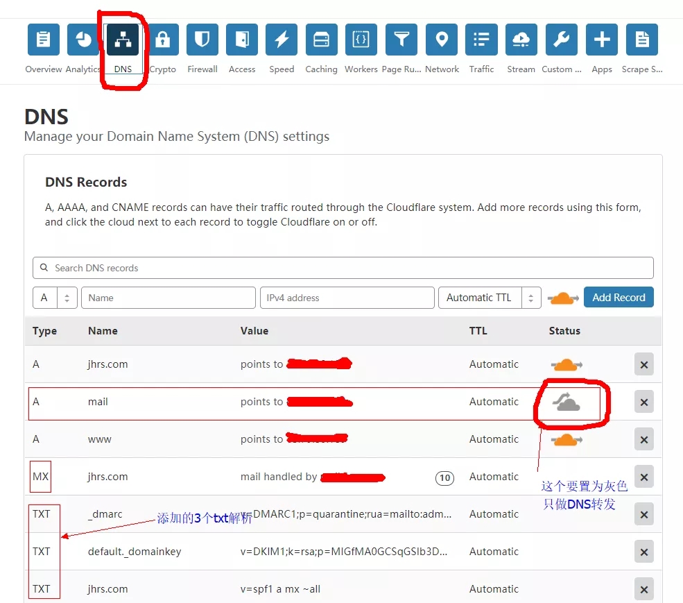 做邮件解析,我们需要添加一条A记录,一条MX记录,3条txt记录,现就这些解析记录说明如下: