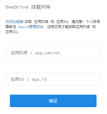 注意:由于onedrive修改了政策,个人Microsoft帐户已无法通过向导进行绑定。 需前往 Azure管理后台 注册应用并获取 app_id 和 app_secret 。