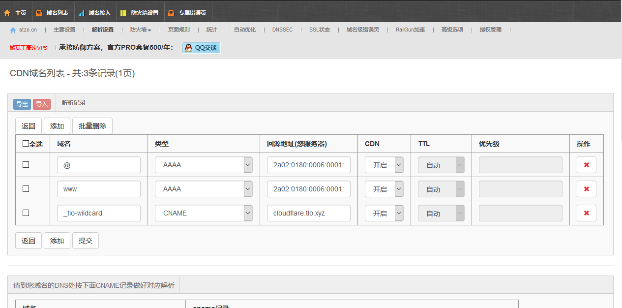 然后,我们去笨牛网,用刚刚注册的cloudflare账号注册笨牛账号,然后添加域名解析,选择cname解析,把它提供的cname地址填到你的域名服务商那里。像这样: