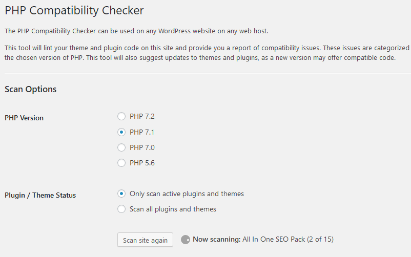 PHP Version 要检测的 PHP 版本选择,Plugin/Theme status 插件与主题检测,Only scan active plugins and themes 只扫描激活的插件与主题,Scan all plugins and themes 扫描全部插件与主题。