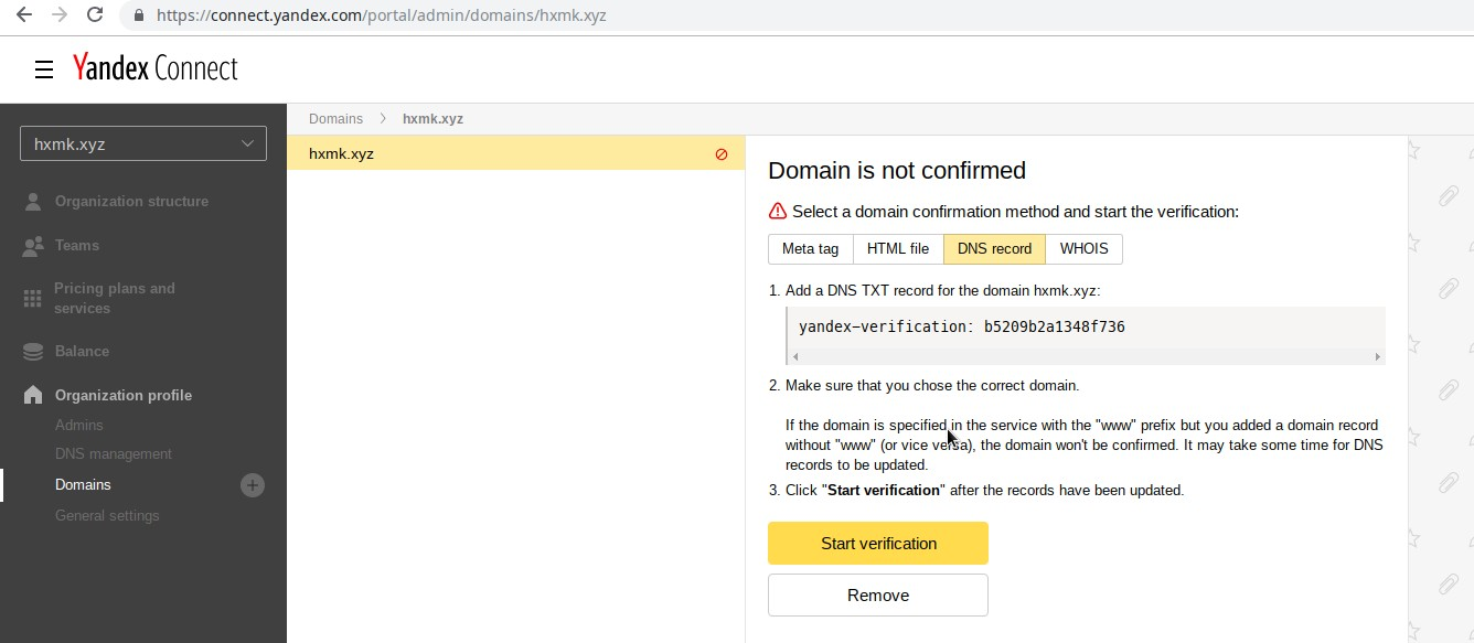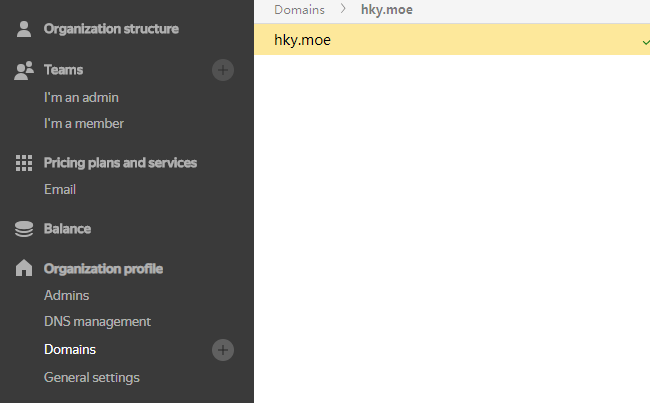 点击Sign up free继续,就会进入Yandex Connect的管理页并自动跳转到Organization profile-Domain选项卡。