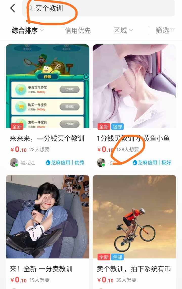如果没有需求单纯只是想用交易养养号的话,去闲鱼搜索栏搜索:买个教训,就会出来一分钱买个教训的商品链接