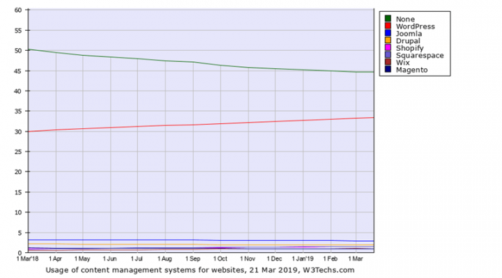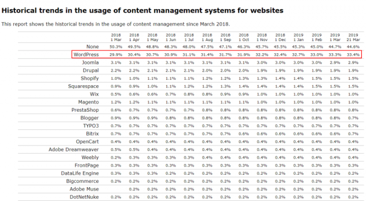 整理2018年3月以来前20名CMS系统使用的历史趋势。数据来源:W3Techs。