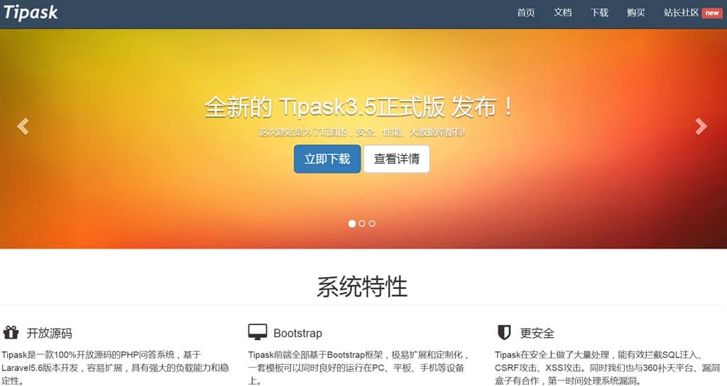 Tipask 3.5 是一款100%开放源码的PHP问答系统, 系统整体构架php框架采用的是Laravel + 前端 Bootstrap , 系统采用了大量的PHP新特性,整个系统从性能、安全、大数据处理都做了很多优化和处理(Redis、队列、云存储等),不管是个人平台还是企业应用都可以放心的使用了。