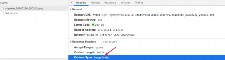 再访问WebP Server的地址进行对比,可以看到图像被压缩为了55.3Kb,MIME类型变为了image/webp,压缩效果非常明显。